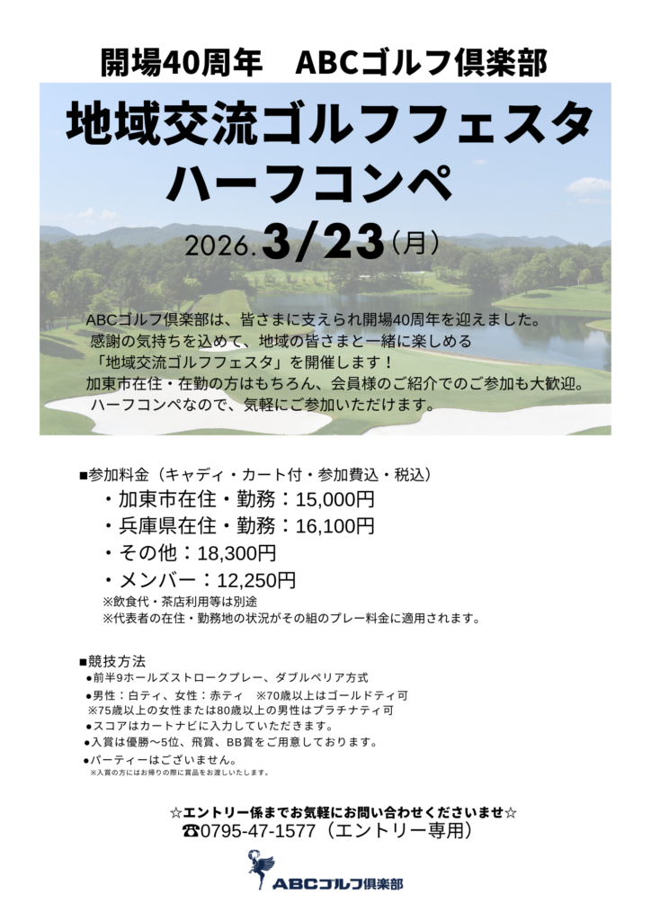 2026.02.03 お知らせ 地域交流ゴルフフェスタ(ハーフコンペ) ABCゴルフ倶楽部は、皆さまに支えられ開場40周年を迎えました。感謝の気持ちを込めて、地域の皆さまと一緒に楽しめる「地域交流ゴルフフェスタ」を開催いたします。 加東市在住・在勤の方はもちろん、会員様のご紹介でのご参加も大歓迎。ハーフコンペなので、気軽にご参加いただけます。
