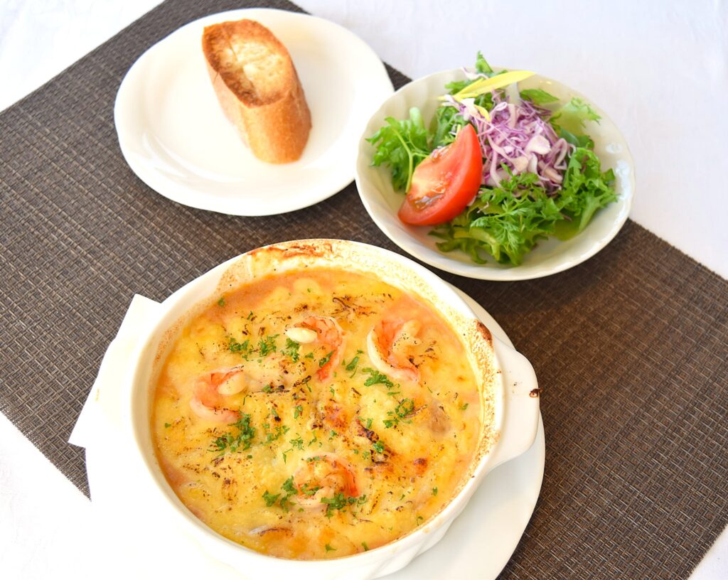シーフード(海老・平ぎ貝・イカ)に 季節の野菜を加えたたっぷりの具材を 特製ホワイトソースに絡め ゴーダチーズを香ばしく焼き上げています。
