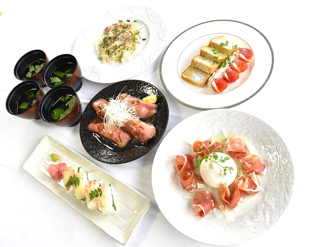 ●自家製ノルウェーサーモンのマリネ ●バナメイ海老のカダイフ巻き ●合鴨のコンフィー香草風味 ●バケット ●季節のデザート