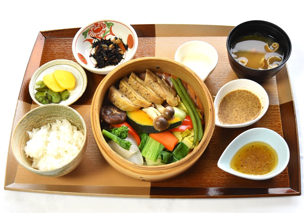 塩麹につけた播州百日鶏と春キャベツ、菜の花などの野菜を せいろで蒸しあげたヘルシーメニューです。 ゴマポン酢・塩だれ・ヨーグルト風味マヨネーズ三種類の ソースをお好みでお召し上がりください。